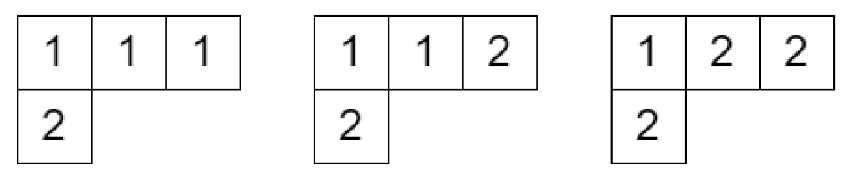 SST((3,1),1) は空集合で、SST((3,1),2) は次の 3 つのタブローからなる集合です。