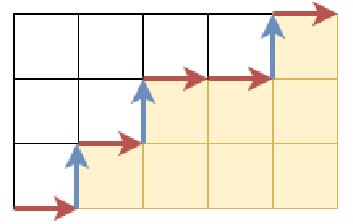 証明します。左辺の の係数が であることを示せばよいです。 の係数は、左辺の各因子において右側の項を 回選ぶことと対応します。選んだ項を とします。 とおくと、 となり、 となります。 番目の右向きの矢印の高さを とすることで、広義単調増加列 はグリッド上の経路と一対一に対応し、 はその経路の下側の面積となります。よって 二項係数が現れます。
