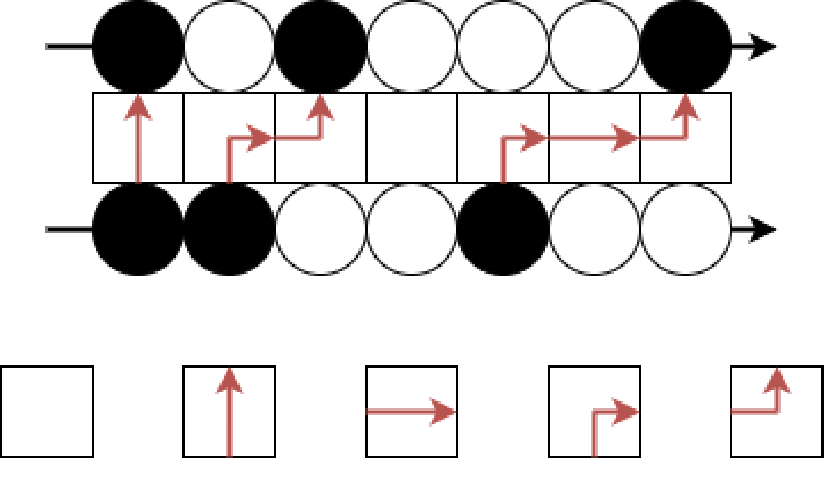 改めて 1 つ目の図を見て白い粒子の動きに注目する。黒い粒子は右にいくつでも動けるが、白い粒子は左に 1 つしか動けないようだ。