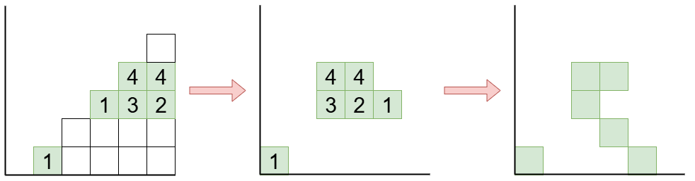 転倒タブローが与えられたとき、新しいタブローの 列目を転倒タブローの 列目とすることで Rothe 図形に数が書き込まれたものになります。 が書かれているマスを 行目に落とすことで、Kohnert 図形が得られます。